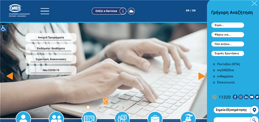 Οι αρχικές επιλογές του νέου ιστότοπου, δίνουν άμεση πρόσβαση στις πιο δημοφιλείς αναζητήσεις, όπως τις e-υπηρεσίες, τα ανοιχτά προγράμματα απασχόλησης, τις παθητικές πολιτικές, τα προγράμματα κοινωνικής πολιτικής, αλλά και τις σημαντικές ανακοινώσεις.