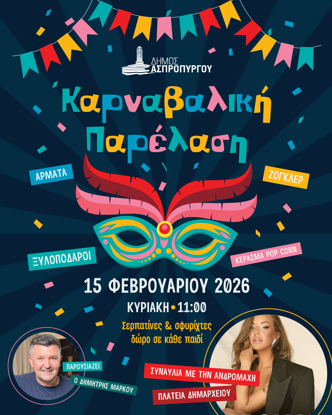 Η Αποκριά είναι χαρά, είναι συμμετοχή, είναι η ευκαιρία να ξαναβρεθούμε όλοι μαζί, μικροί και μεγάλοι, και να γιορτάσουμε με κέφι, χαμόγελο και αισιοδοξία.