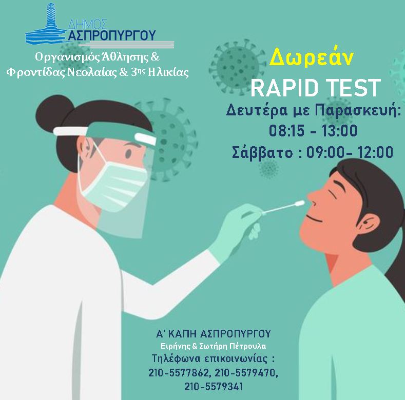 Ο Πρόεδρος του Οργανισμού Άθλησης και Φροντίδας, Νεολαίας και Τρίτης Ηλικίας του Δήμου Ασπροπύργου, κ. Ιωάννης Κατσαρός  ενημερώνει τους δημότες ότι, από το Σάββατο, 10 Ιουλίου 2021 στο Α’ ΚΑΠΗ Ασπροπύργου, θα διενεργούνται Δωρεάν rapid test και κάθε Σάββατο, έπειτα από τηλεφωνικό ραντεβού.