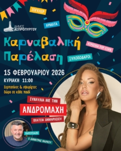Η καρναβαλική παρέλαση θα πραγματοποιηθεί την Κυριακή 15 Φεβρουαρίου 2026, με ώρα έναρξης τις 11:00 π.μ., όπου μικροί και μεγάλοι αναμένεται να συμμετάσχουν σε μια γιορτή γεμάτη χρώμα, μουσική και αποκριάτικη διάθεση.