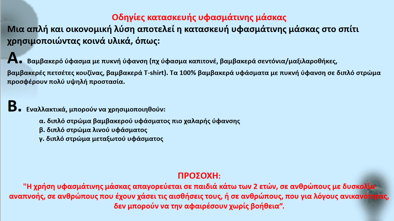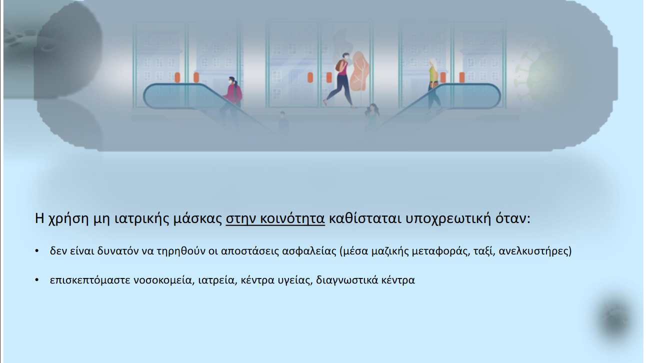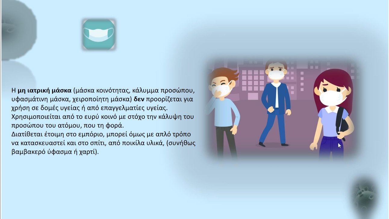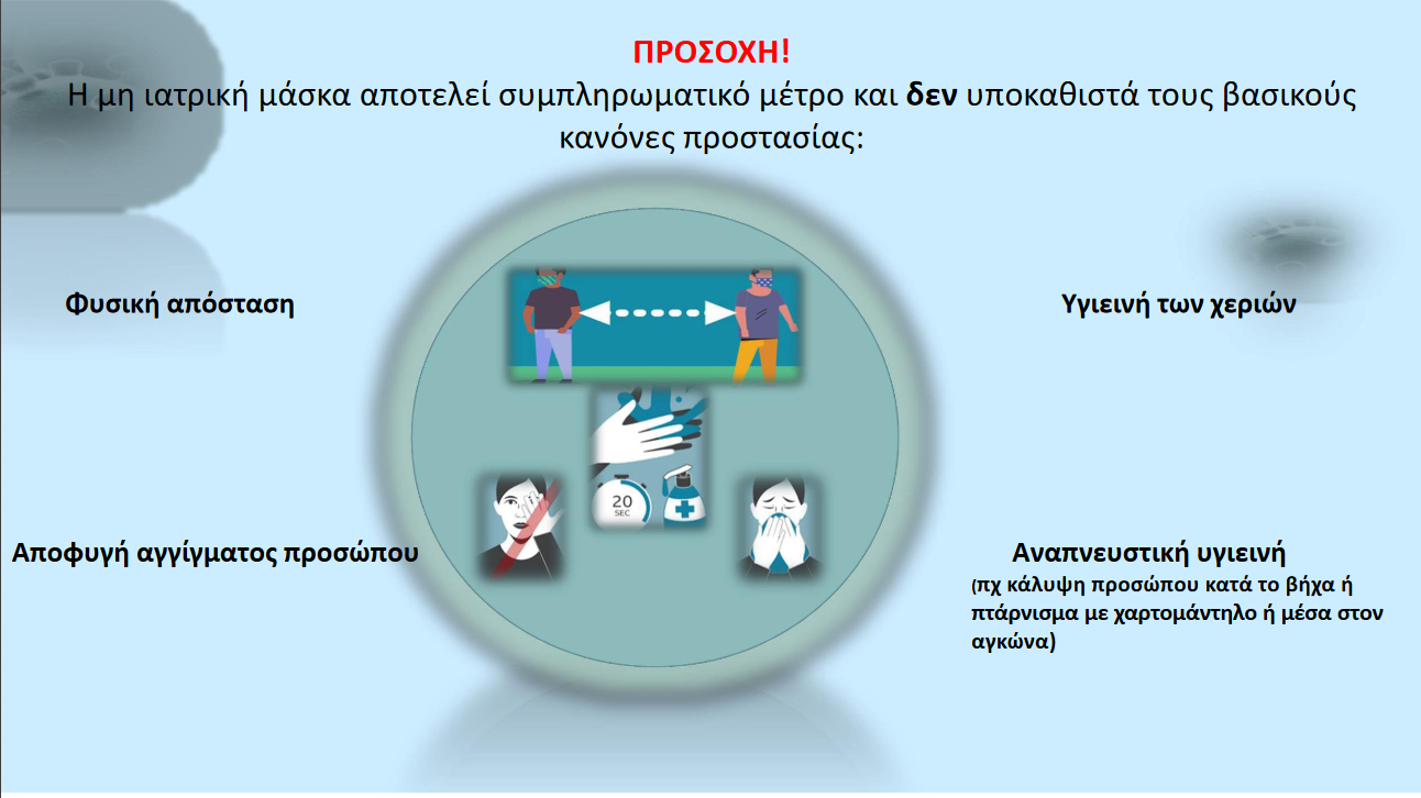 Επισημαίνεται τέλος, ότι η χρήση μη ιατρικής μάσκας αποτελεί συμπληρωματικό μέτρο και δεν υποκαθιστά τους βασικούς κανόνες προστασίας.