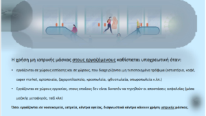 Η χρήση μη ιατρικής μάσκας στους εργαζόμενους καθίσταται υποχρεωτική όταν εργάζονται σε σούπερ μάρκετ χώρους εστίασης χώρους διαχείρισης μη τυποποημένων τροφίμων (κρεοπωλεία ιχθυοπωλεία, ζαχαροπλαστεία κ.α.) και σε οσους εργάζονται σε χώρους εργασίας στους οποίους δεν είναι δυνατόν να τηρηθούν οι αποστάσεις ασφαλείας (π.χ. μέσα μαζικής μεταφοράς). Όσοι εργάζονται σε νοσοκομεία ιατρεία κέντρα υγείας και διαγνωστικά κέντρα κάνουν χρήση ιατρικής μάσκας.