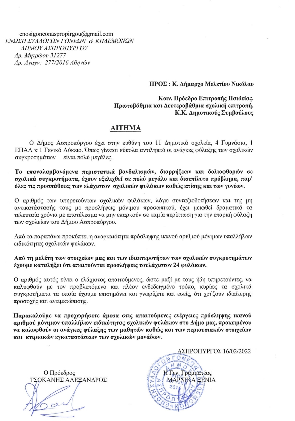 Η Ένωση Γονέων και Κηδεμόνων Δήμου Ασπροπύργου κατέθεσε αίτημα για άμεση πρόσληψη σχολικών φυλάκων.