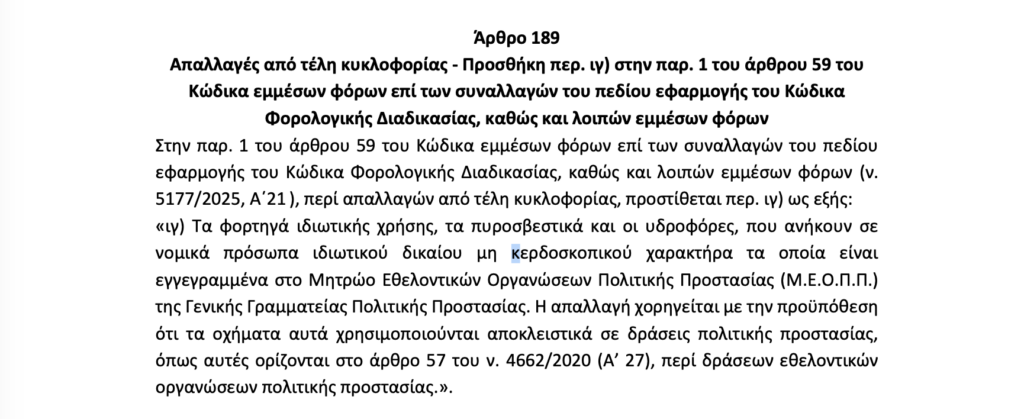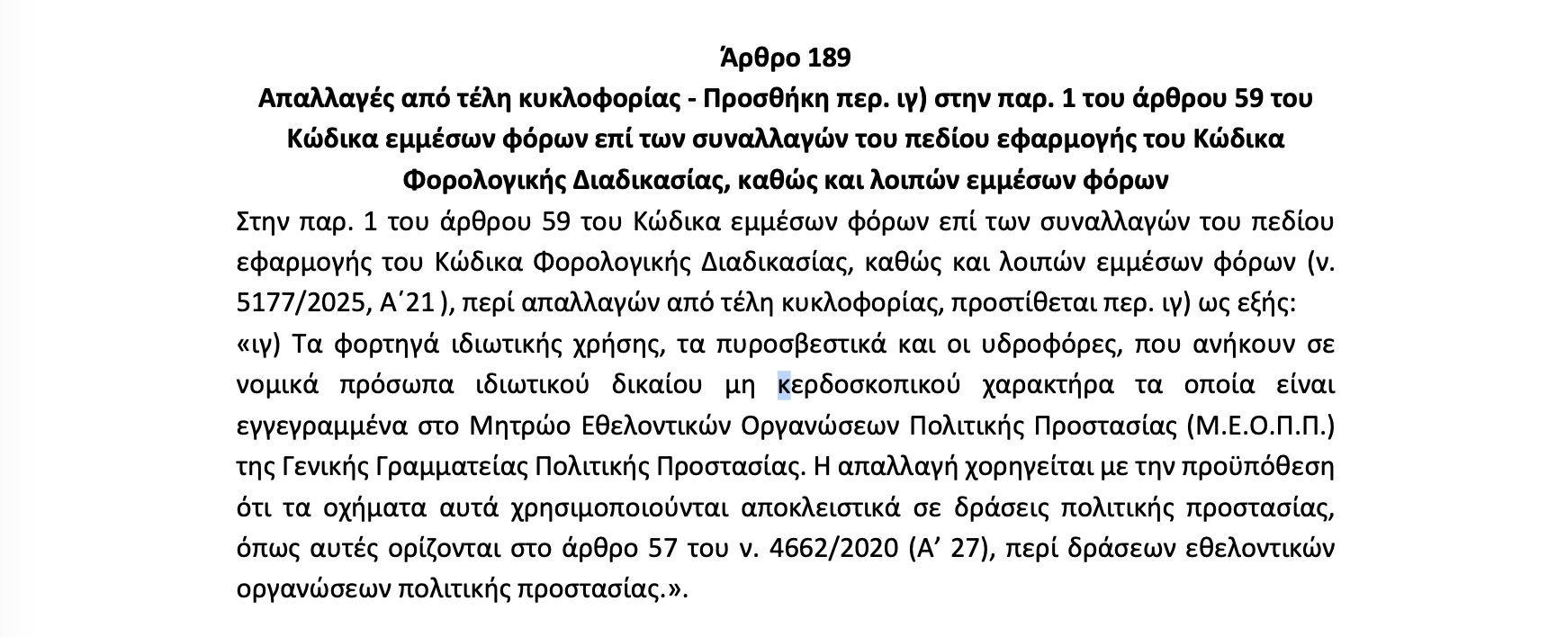 Σχετική διάταξη, που εντάσσεται στο νομοσχέδιο του ΥΠΕΘΟΟ, το οποίο έχει τεθεί ήδη σε διαβούλευση, προβλέπει ότι τα φορτηγά ιδιωτικής χρήσης, τα πυροσβεστικά και οι υδροφόρες, που ανήκουν σε νομικά πρόσωπα ιδιωτικού δικαίου μη κερδοσκοπικού χαρακτήρα, τα οποία είναι εγγεγραμμένα στο μητρώο Εθελοντικών Οργανώσεων της Γενικής Γραμματείας της Πολιτικής Προστασίας, απαλλάσσονται από τα τέλη κυκλοφορίας, με την προϋπόθεση ότι τα οχήματα αυτά χρησιμοποιούνται αποκλειστικά σε δράσεις πολιτικής προστασίας.