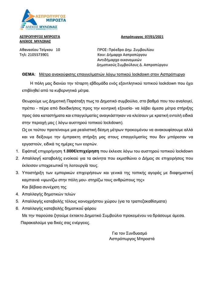 Η Δημοτική παράταξη “Ασπρόπυργος Μπροστά”, με επικεφαλής τον Αλέκο Μυλωνά, ζήτησε την σύγκληση Δημοτικού Συμβουλίου με θέμα τα μέτρα ανακούφισης επαγγελματιών του Δήμου, λόγω του τοπικού lockdown. Μεταξύ των μέτρων που προτείνει ο Συνδυασμός είναι η εφάπαξ επιχορήγηση 1.000€ σε κάθε επιχείρηση που έκλεισε με κρατική εντολή. Ακόμη προτείνεται η απαλλαγή καταβολής των δημοτικών τελών, του δημοτικού φόρου και του τέλους κοινόχρηστου χώρου από τις επιχειρήσεις.