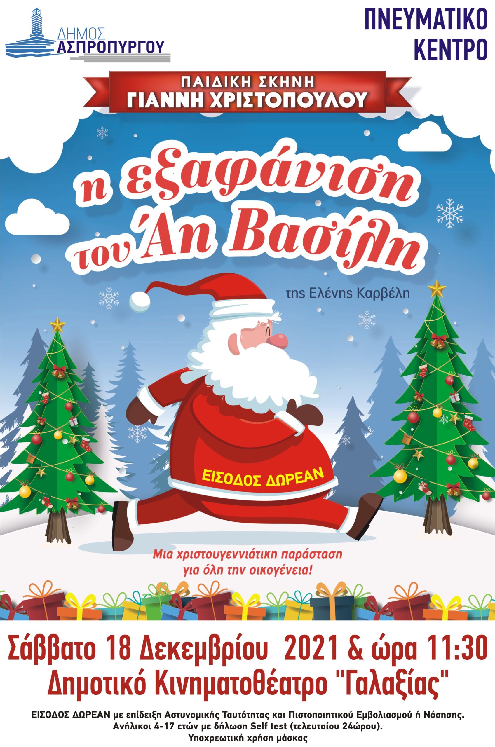 Ενόψει των εορταστικών ημερών το Πνευματικό Κέντρο Ασπροπύργου διοργανώνει ΔΩΡΕΑΝ χριστουγεννιάτική θεατρική παράσταση για τα παιδιά της πόλης, με θέμα: