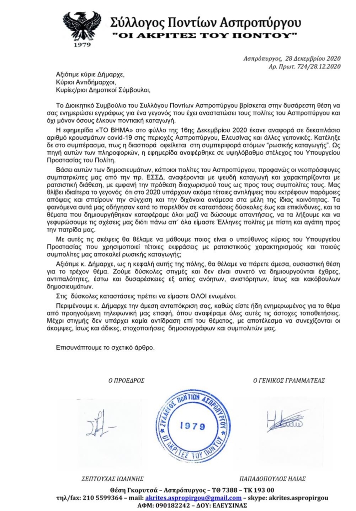Ο Σύλλογος Ποντίων Ασπροπύργου “Οι Ακρίτες του Πόντου” έστειλε επιστολή προς τον Δήμαρχο Ασπροπύργου, Μελετίου Νικόλαο, σχετικά με ένα δημοσίευμα στην ιστοσελίδα της εφημερίδας “Το ΒΗΜΑ”, στο οποίο οι κάτοικοι του Ασπροπύργου ποντιακής καταγωγής αναφέρονται ως “άτομα ρωσικής καταγωγής”. Προφανώς ο χαρακτηρισμός αφορά τους παλιννοστούντες από την πρώην Σοβιετική Ένωση, οι οποίοι κατοικούν στον Ασπρόπυργο, βορειοδυτικά του Δήμου. Ο Σύλλογος στην επιστολή του αποδοκιμάζει τον χαρακτηρισμό και καταγγέλλει τα δημοσιεύματα, ότι προσπαθούν να καλλιεργήσουν ρατσιστική διάθεση και να διαχάσουν την κοινωνία την δύσκολη αυτή εποχή της υγειονομικής κρίσης. Το Δ.Σ. του Συλλόγου ζητά από τον Δήμαρχο να τοποθετηθεί στο ζήτημα που προέκυψε, καθώς πολλοί κάτοικοι του Ασπροπύργου έχουν αναστατωθεί.