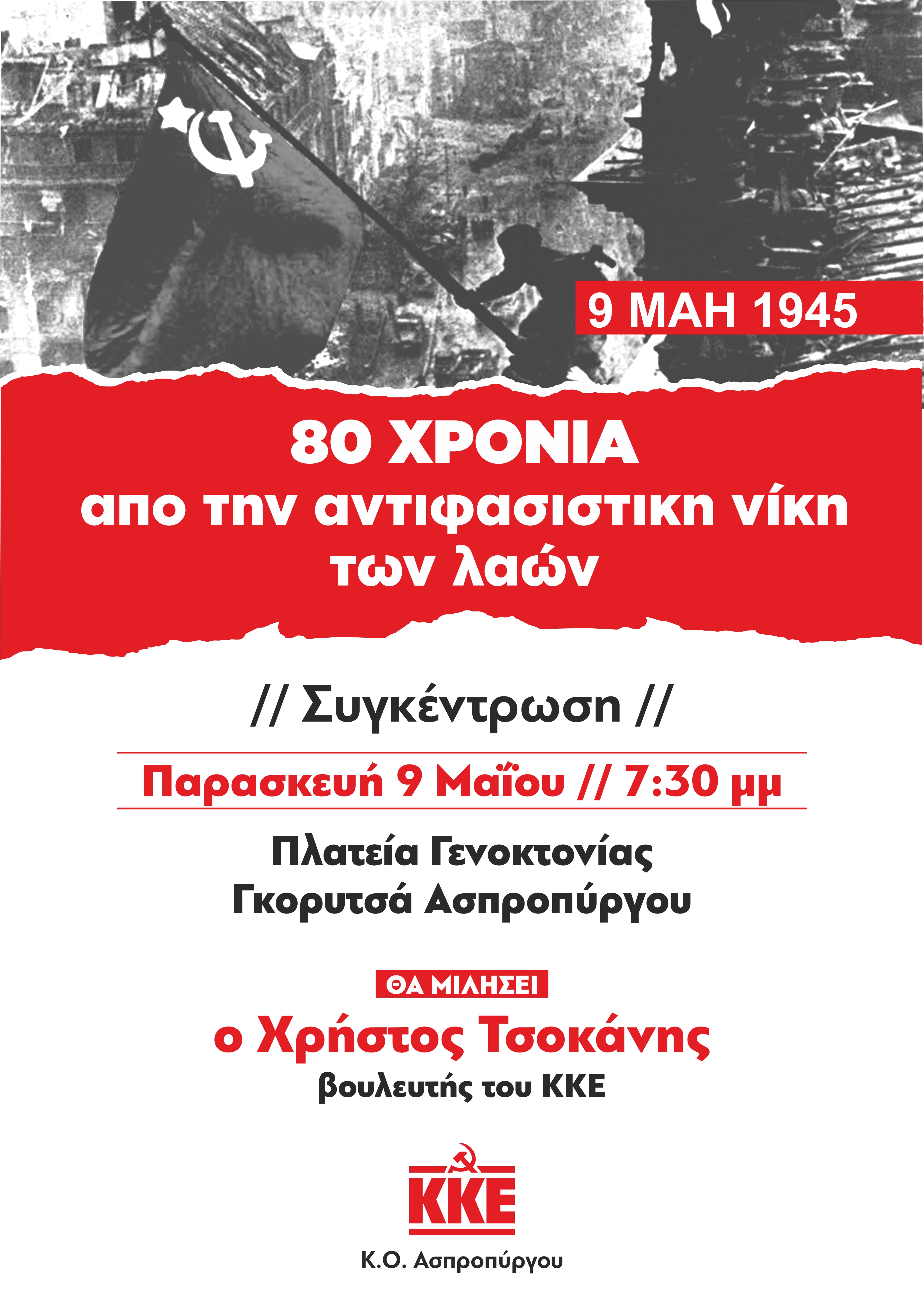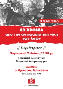 Η Κ.Ο. του ΚΚΕ Ασπροπύργου καλεί σε συγκέντρωση για την 9 МАН 1945 και την Ημέρα Αντιφασιστικής Νίκης των Λαών στην Πλατεία Γενοκτονίας, Γκορυτσά Ασπροπύργου. Στην εκδήλωση θα μιλήσει ο Χρήστος Τσοκάνης, βουλευτής του ΚΚΕ.