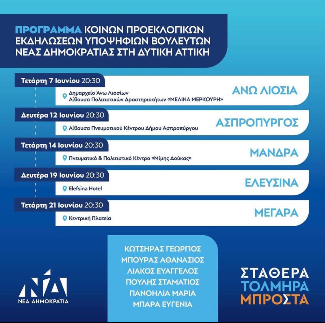 Κοινή εκδήλωση των υποψηφίων της Νέας Δημοκρατίας σήμερα στον Ασπρόπυργο, στις 20:30, στο Πνευματικό Κέντρο.