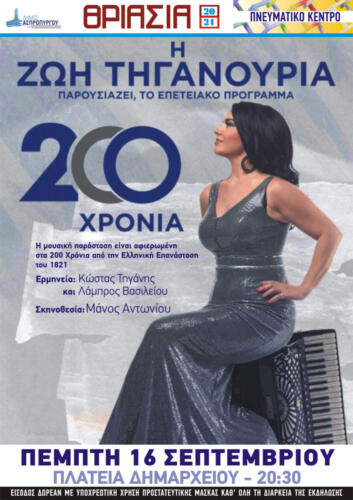 «Η μουσικοσυνθέτης Ζωή Τηγανούρια, με προπομπό την επετειακή της σύνθεση «Επανάσταση 1821 – Ζήτω η Ελευθερία», παρουσιάζει μια μουσική παράσταση που υμνεί την επέτειο των 200 χρόνων, μέσα από ορχηστρικές μελωδίες, αφηγηματικά κείμενα και τραγούδια, που μιλούν στις καρδιές και τις συνειδήσεις. Ένα μουσικό πέρασμα από τους ήχους των Βαλκανίων του χθες και του σήμερα, τη διαχρονική Ελληνική Παράδοση και τη σύγχρονη μουσική της συνέχεια, μέχρι τα σπουδαία διεθνή μουσικά έργα, σε έναν έξυπνο και συνάμα επιμορφωτικό χρονικό παραλληλισμό. Ακορντεόν – Καλλιτεχνική Επιμέλεια: Ζωή Τηγανούρια, Ερμηνεύει ο Λάμπρος Βασιλείου, Κλαρίνο : Τρύφωνας Παπαϊωάννου, Κρουστά: Στέλιος Γενεράλης, Μπάσο: Γιάννης Γρηγορίου, Λαούτο, Ούτι, Ταμπουρά :Γιώργος Παππάς, Αφηγητής: Γιάννης Κωσταράς, Σκηνοθεσία: Μάνος Αντωνίου».