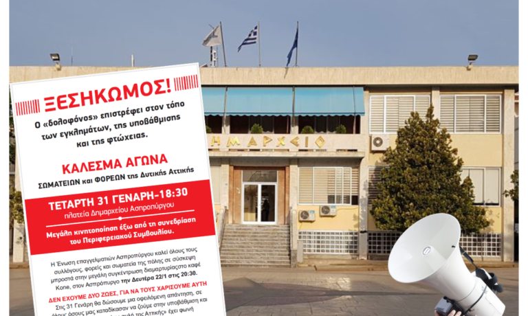 Ένωση Eπαγγελματιών Ασπροπύργου: κάλεσμα για σύσκεψη ενόψει της συγκέντρωσης διαμαρτυρίας