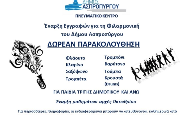 Έναρξη εγγραφών για τη Φιλαρμονική του Δήμου Ασπροπύργου